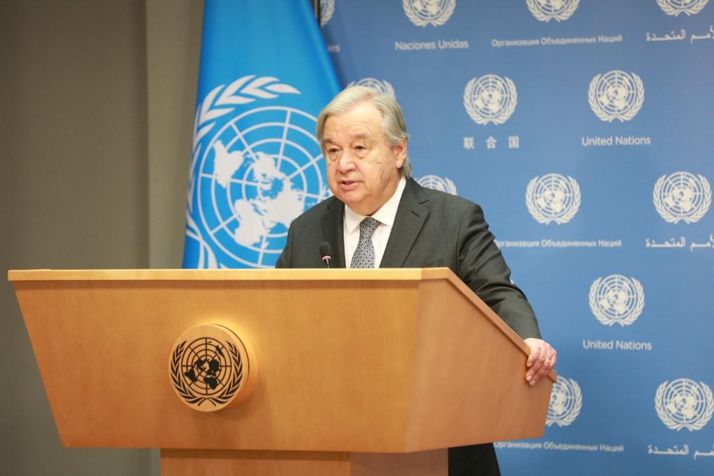 5月17日,在位于纽约的联合国总部,联合国秘书长古特雷斯在记者会上讲话。新华社记者谢锷摄