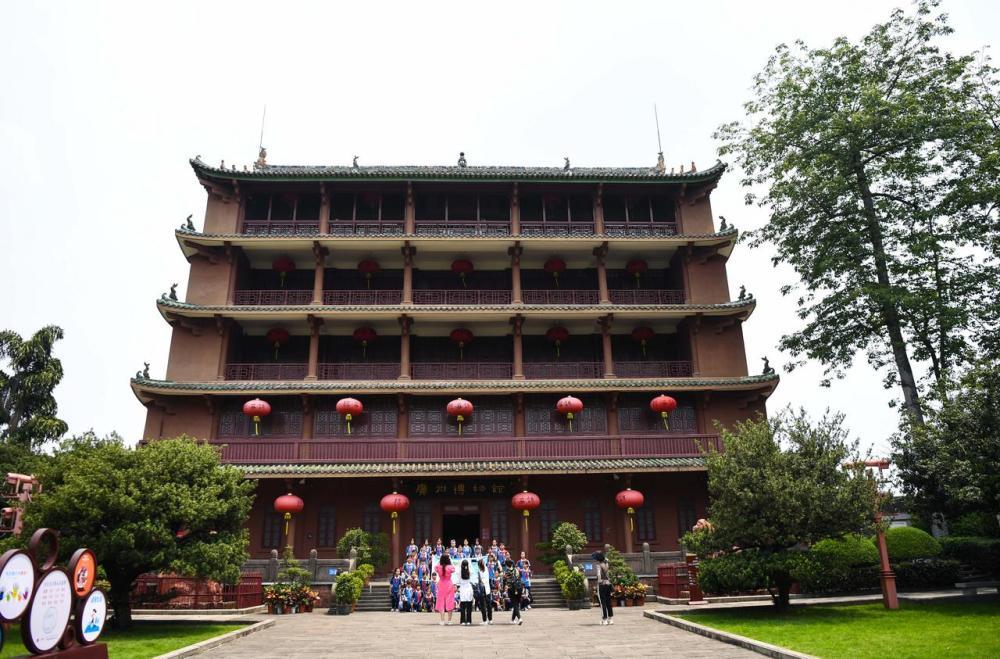 6月13日,在广州博物馆镇海楼前,参观者合影留念。新华社记者 邓华 摄