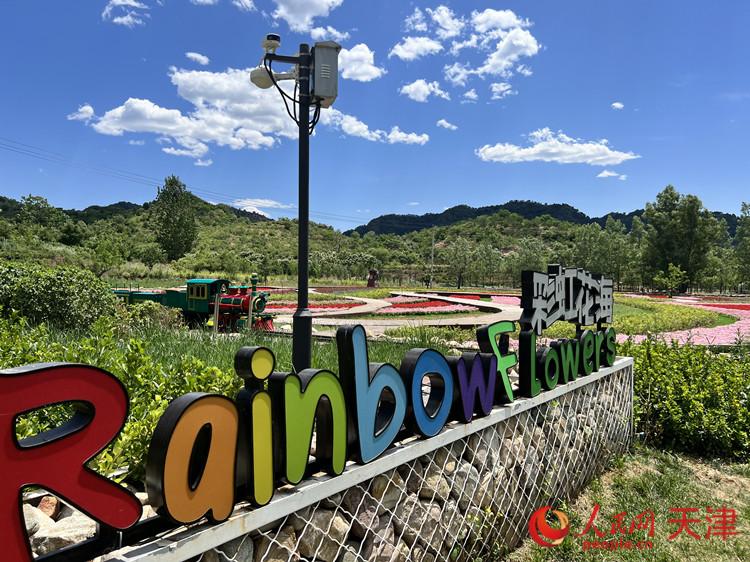 阳光下,郭家沟村的“彩虹花海”与蓝天白云相映如画。人民网记者 孙翼飞摄