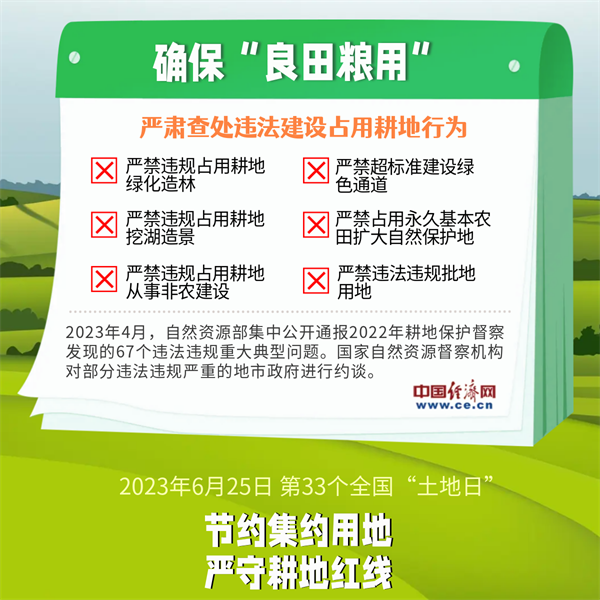 “民非谷不食,谷非地不生”。耕地是保障国家粮食安全的根本,耕地红线必须严防死守。2023年全国自然资源工作会议强调,准确把握新时代新征程自然资源工作“严守资源安全底线、优化国土空间格局、促进绿色低碳发展、维护资源资产权益”的定位。