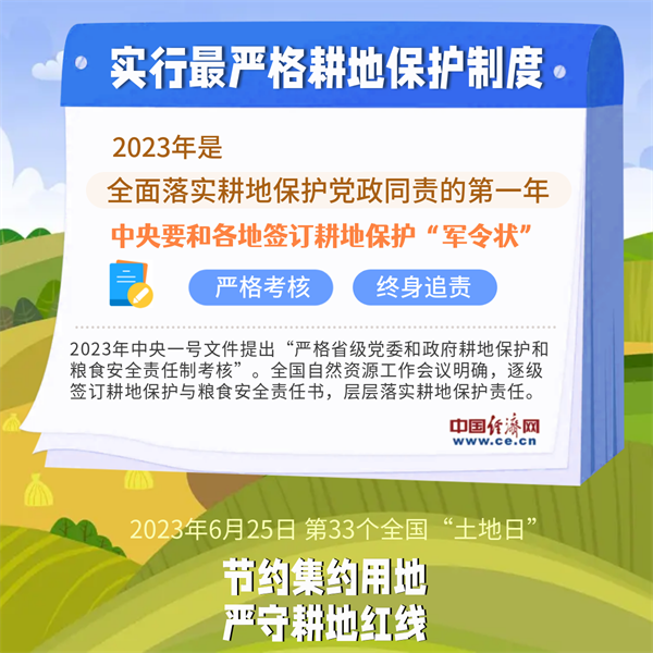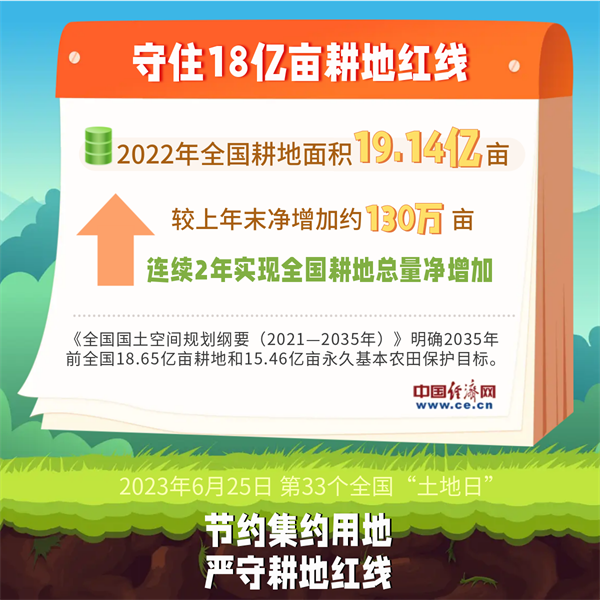 中国经济网北京6月25日讯(记者 杨秀峰 景远)6月25日是第33个全国“土地日”,今年的主题是“节约集约用地 严守耕地红线”。自然资源部表示,希望全社会树立节约用地、保护耕地的意识,像保护大熊猫一样保护耕地,让每一寸土地都成为丰收的沃土。
