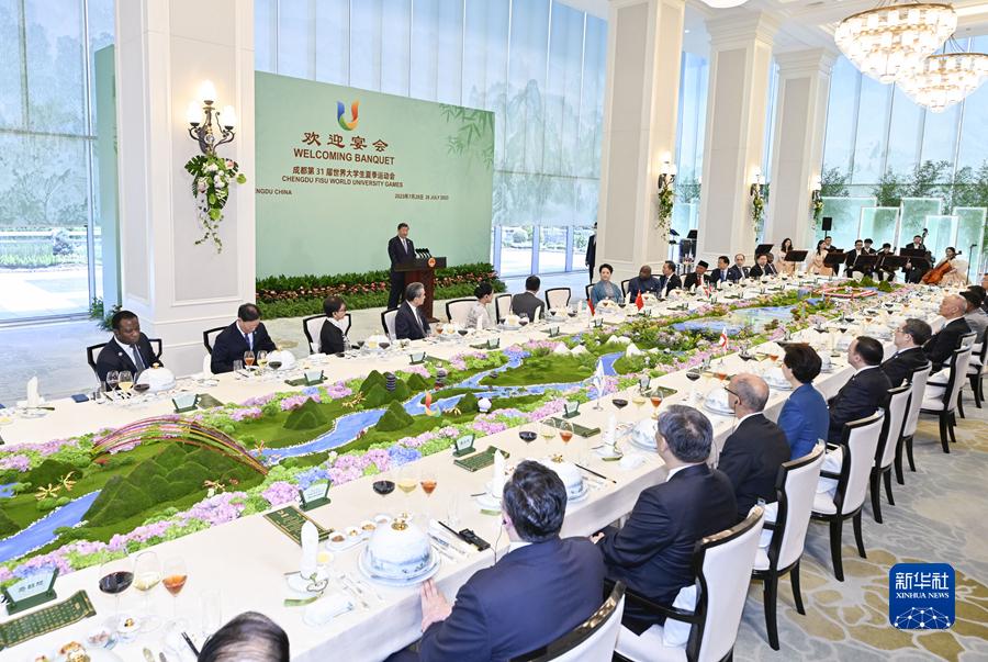 新华社成都7月28日电(记者刘华、叶含勇)7月28日中午,国家主席习近平和夫人彭丽媛在四川省成都市金牛宾馆举行宴会,欢迎出席成都第31届世界大学生夏季运动会开幕式的国际贵宾。