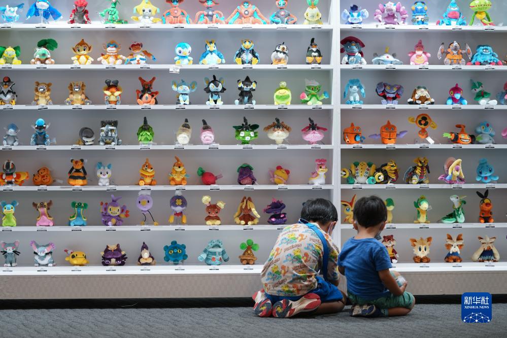 8月13日,两个小孩在日本横滨未来港宝可梦商店展示柜前玩耍。