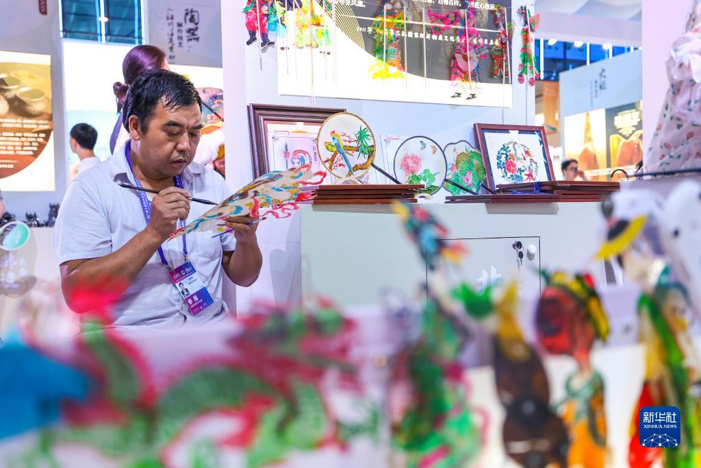 8月17日,参展商在云南腾冲皮影展位上绘制皮影。