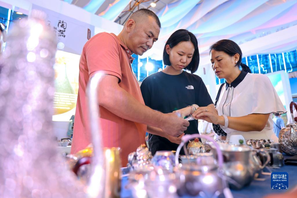 8月17日,参观者在银器锻制技艺展位上选购商品。