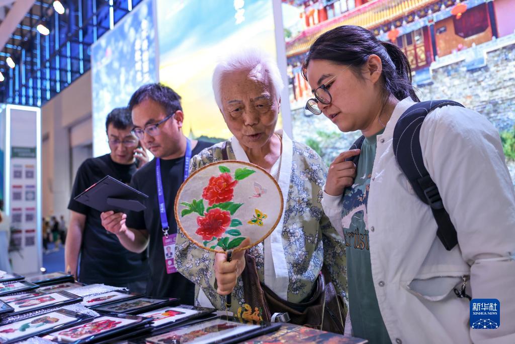 8月17日,参观者在云南腾冲皮影展位上选购特色商品。