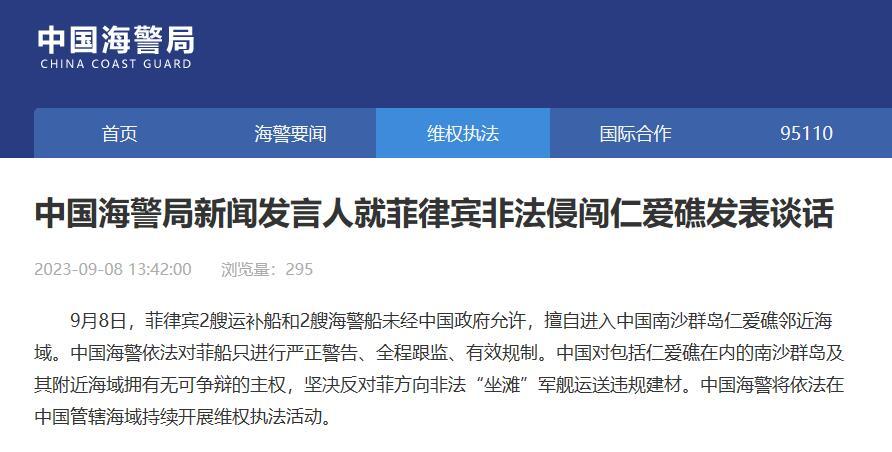 中国海警局新闻发言人就菲律宾非法侵闯仁爱礁发表谈话