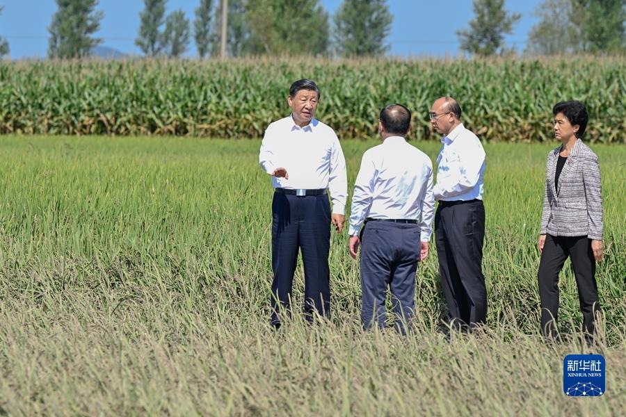 9月6日至8日,中共中央总书记、国家主席、中央军委主席习近平在黑龙江考察。这是7日上午,习近平在遭受洪涝灾害的哈尔滨尚志市老街基乡龙王庙村,察看水稻受灾情况。新华社记者 谢环驰 摄