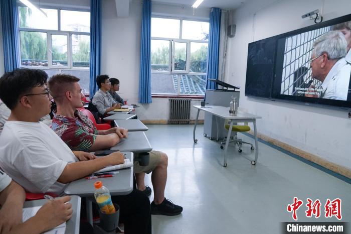 图为青海民族大学课堂上,Alex(左二)和学生们坐在一起观看视频。 马铭言 摄