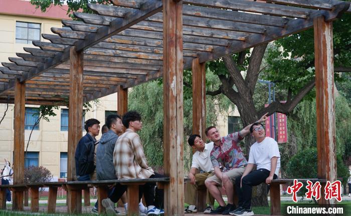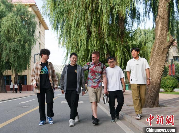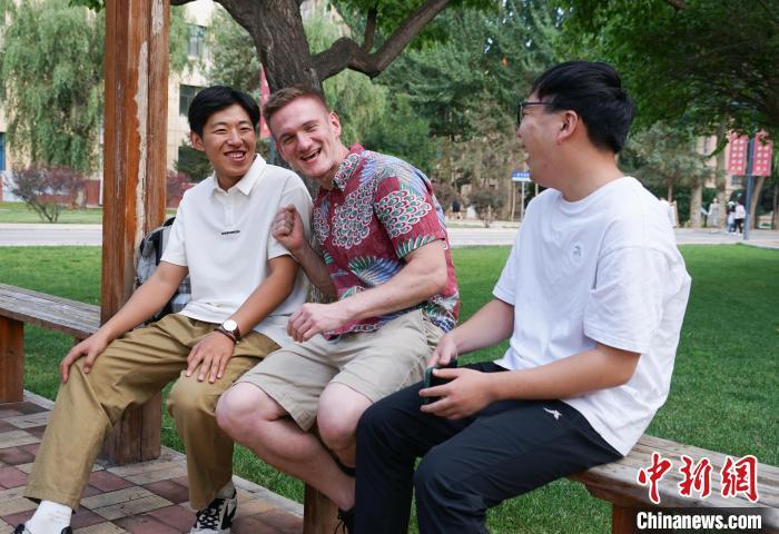 图为青海民族大学校园内,Alex(中)和学生们聊天。 马铭言 摄