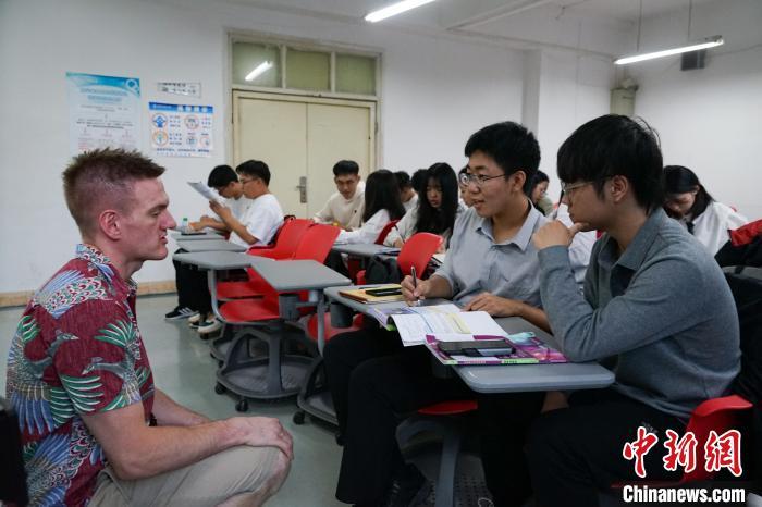 图为青海民族大学课堂上,Alex(左一)耐心地给学生们答疑解惑。 马铭言 摄