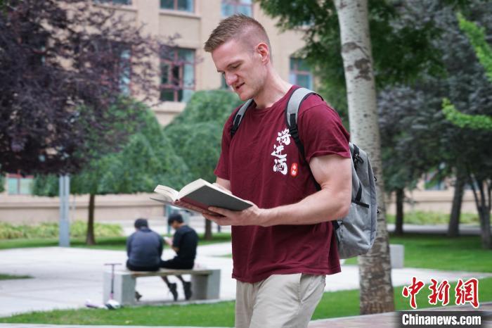 图为青海民族大学校园内,Alex手拿书籍边走边看前往教室。 马铭言 摄