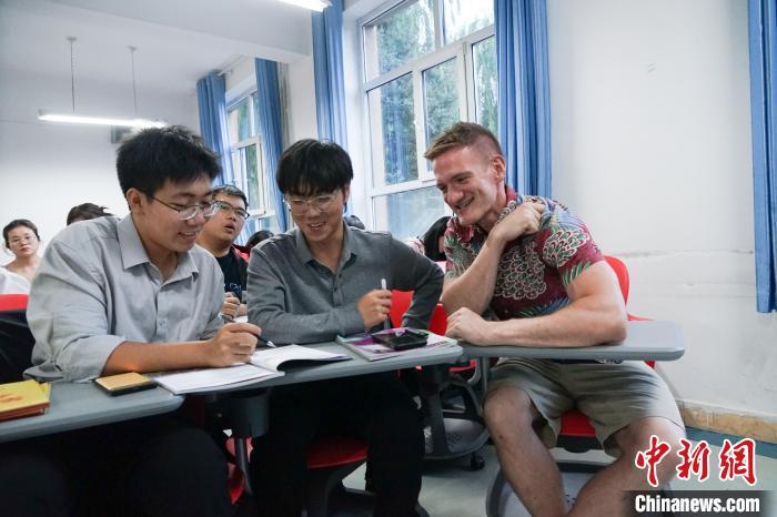 图为青海民族大学课堂上,Alex(右一)听取学生的课堂反馈。 马铭言 摄