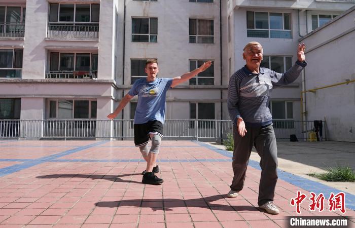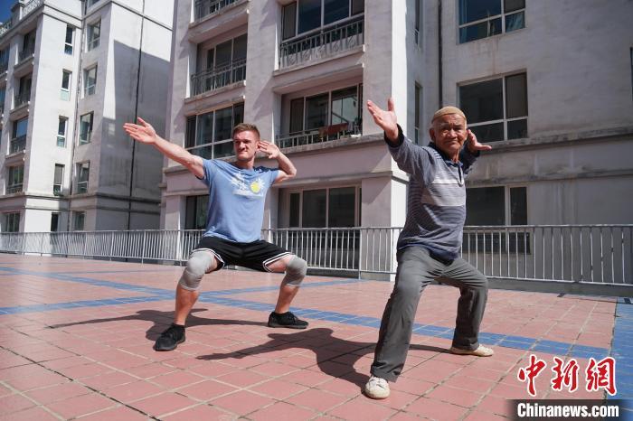 图为在青海省西宁市一小区内,Alex(左)跟随八门拳师傅学习拳法。 马铭言 摄