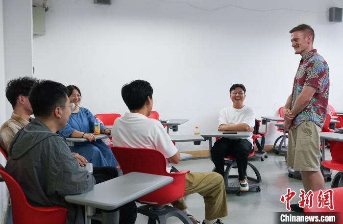 图为青海民族大学教室内,Alex(右一)和学生们在上课前聊天。 马铭言 摄