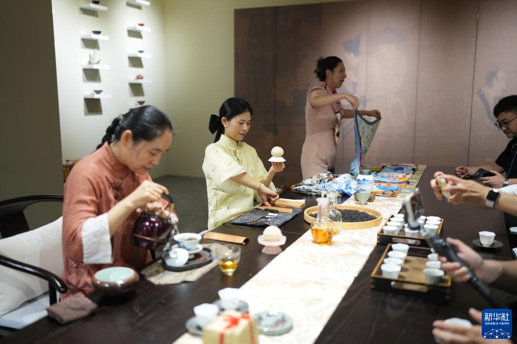 9月12日,工作人员在亚运村内展示茶艺、茶点、丝绸。