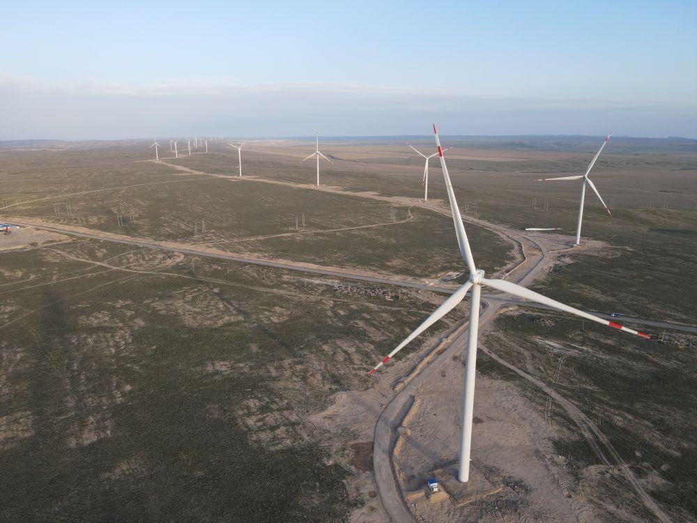 ↑这是2021年4月25日在哈萨克斯坦扎纳塔斯拍摄的风电场风机(无人机照片)。扎纳塔斯风电项目于2018年列入中哈产能合作清单重点项目。