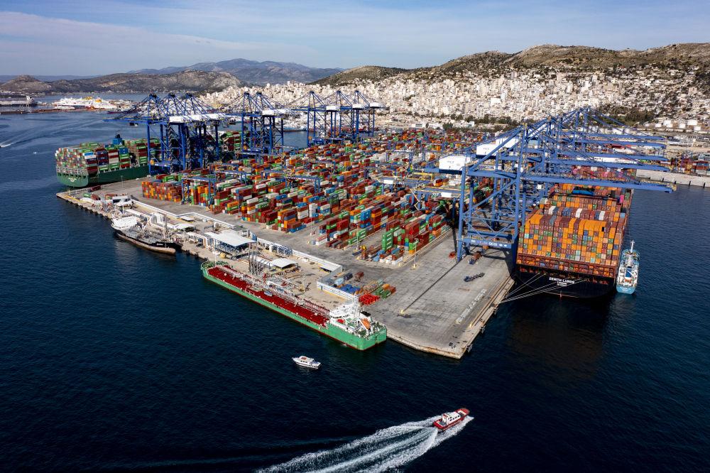 ↑这是2022年2月19日拍摄的希腊比雷埃夫斯港集装箱3号码头(无人机照片)。作为“一带一路”倡议的典范项目,希腊比雷埃夫斯港年货物吞吐量增至500万标箱以上,跃升为欧洲第四大集装箱港口、地中海领先集装箱大港。