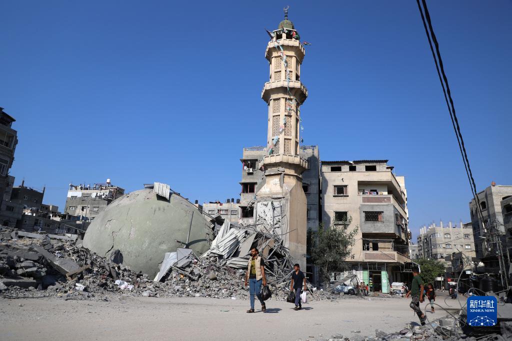 10月11日,在加沙城,人们走过以色列空袭炸毁的建筑废墟。新华社发(里泽克·阿卜杜勒贾瓦德摄)