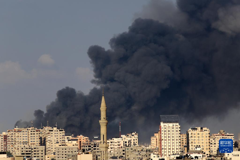 10月11日,加沙城的建筑遭以色列空袭后升起浓烟。新华社发(里泽克·阿卜杜勒贾瓦德摄)