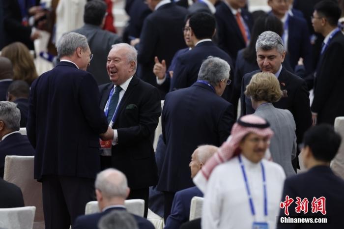 10月18日,第三届“一带一路”国际合作高峰论坛在北京举行开幕式。图为与会代表在开幕式前沟通。中新社记者 韩海丹 摄