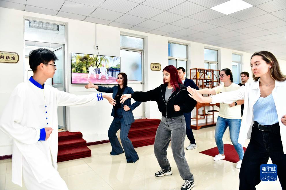 10月18日,在青岛西海岸新区中医医院,来自山东科技大学国际交流学院的留学生在学习八段锦。