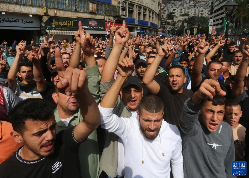 10月18日,在约旦河西岸城市纳布卢斯,民众上街游行抗议加沙医院遭袭。