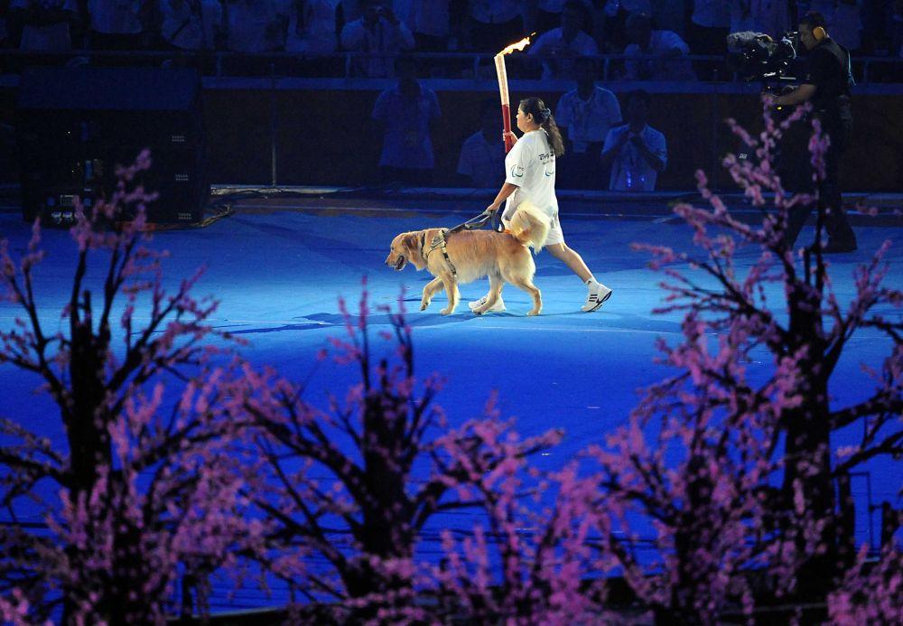 2008年9月6日,北京2008年残奥会开幕式在国家体育场隆重举行,火炬手平亚丽在进行火炬传递。新华社记者王颂摄