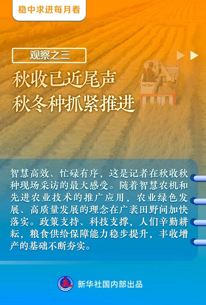 投资项目加快落地、文体旅消费热度攀升、中小企业信心回升……随着一系列政策组合拳加快落地实施,10月份各地加快推进经济社会发展。进入四季度,各方坚定信心,落实好经济社会发展各项重点任务,不断夯实经济回升的基础,为实现全年发展目标打下坚实基础。