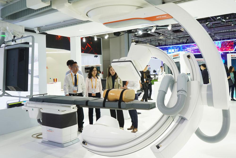 11月5日在第六届进博会医疗器械及医药保健展区西门子展台拍摄的全球首款量子能谱血管造影系统。(新华社记者金皓原摄)