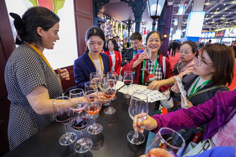 11月6日,参观者在第六届进博会国家展格鲁吉亚展台品尝格鲁吉亚红酒。(新华社记者辛梦晨摄)
