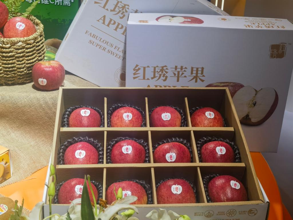人头攒动的食品及农产品展区,记者在鑫荣懋展台见到一款在云南丽江泸沽湖畔海拔2740米高原上种植的、源自新西兰的新品种“红琇苹果”。