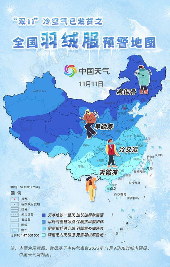 全国羽绒服预警地图出炉 三分之二国土需羽绒服护体