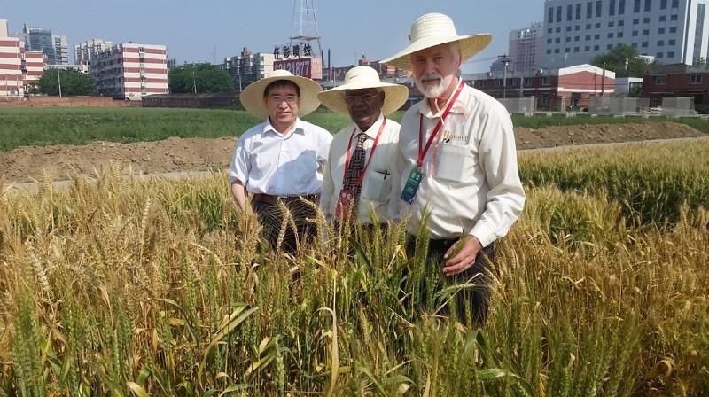 2017年,托马斯·兰普金与中国小麦育种专家何中虎以及来自印度的专家桑杰·拉贾拉姆,在中国农科院的小麦试验田里