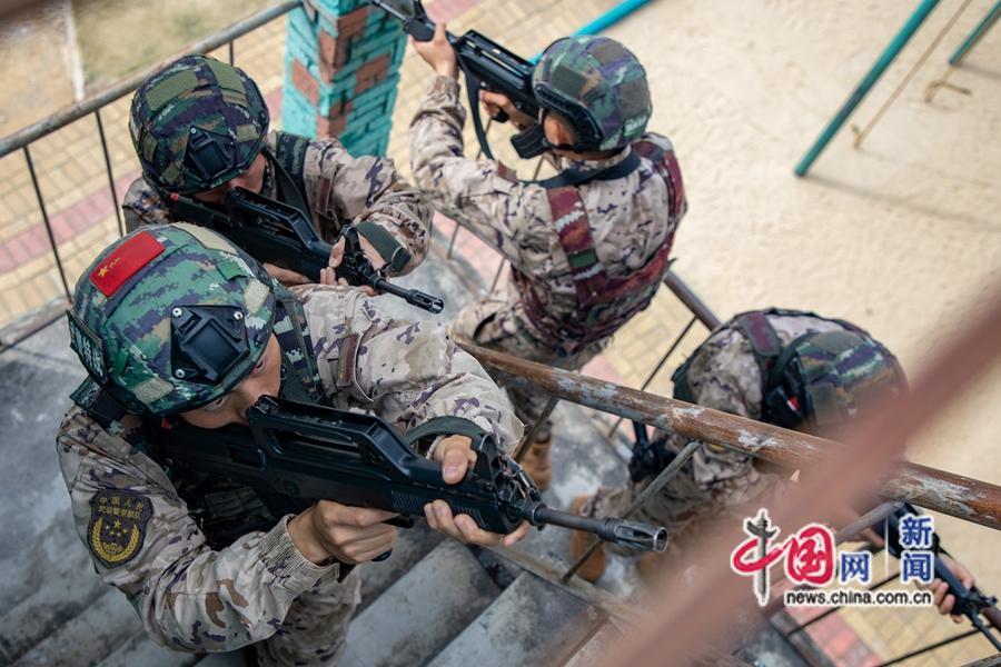 2024年1月9日,武警官兵在楼梯处搜索前进。刘坚 摄 中国网 发