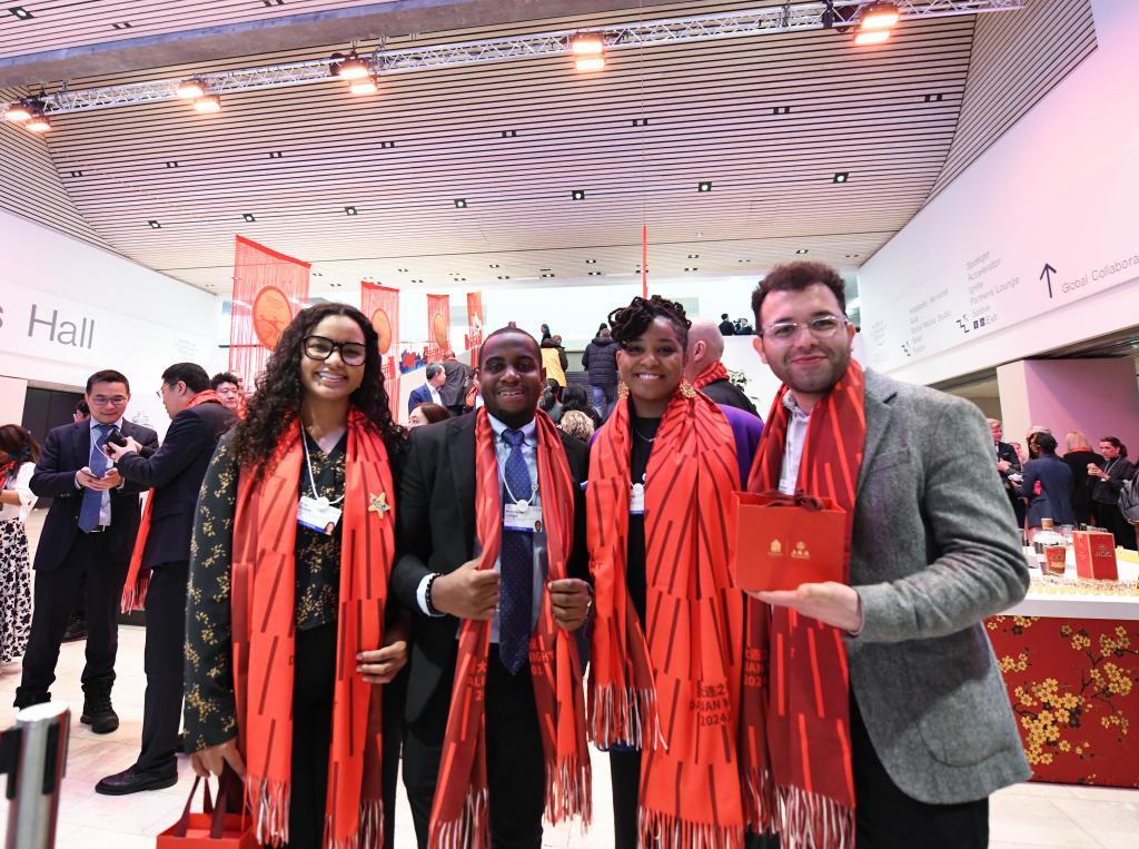 1月16日,在瑞士达沃斯,与会者在“大连之夜”招待会上合影。新华社记者连漪摄