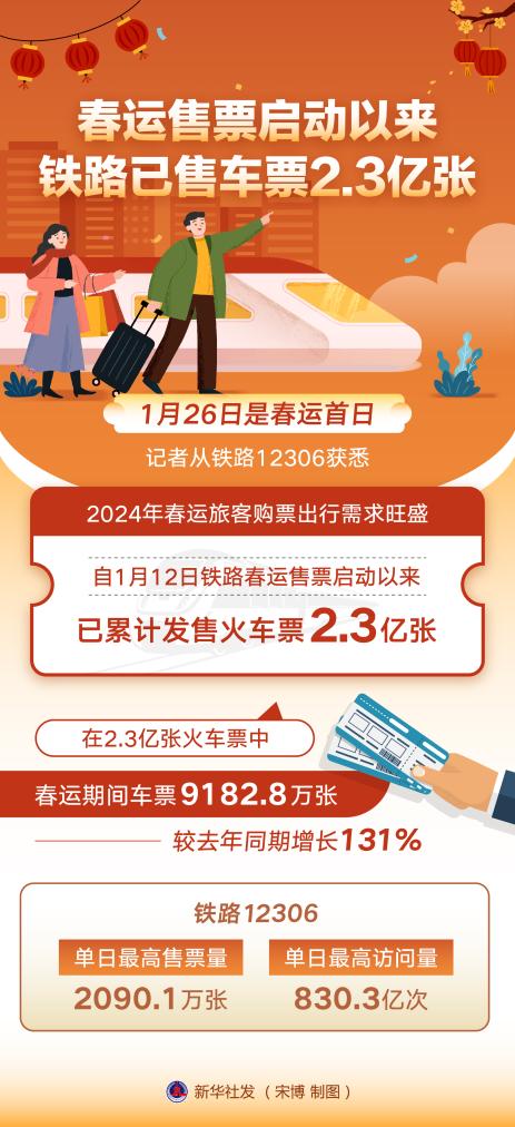 新华社北京1月26日电(记者韩佳诺、丁静)26日是春运首日。记者从铁路12306获悉,今年春运旅客购票出行需求旺盛,自1月12日铁路春运售票启动以来,已累计发售火车票2.3亿张。