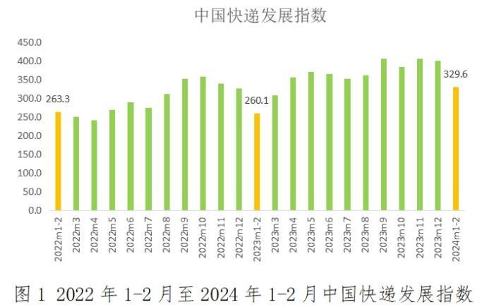 据国家邮政局微信公众号消息,经测算,2024年1-2月中国快递发展指数为329.6,同比提升26.7%。其中发展规模指数、服务质量指数和发展能力指数分别为407.1、459.3、210.1,同比分别增长29.8%、39.4%、7.1%。发展趋势指数为66。1-2月,快递业实现良好开局,市场规模快速增长,服务场景日益丰富,节日运行安全有序,发展能力稳步增强。