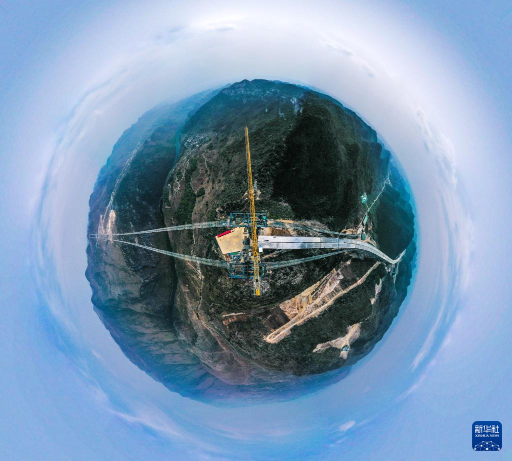 这是3月27日拍摄的花江峡谷大桥建设场景(无人机全景照片)。