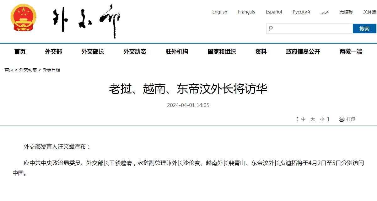 中国网4月1日讯 据外交部网站1日消息,外交部发言人汪文斌宣布:应中共中央政治局委员、外交部长王毅邀请,老挝副总理兼外长沙伦赛、越南外长裴青山、东帝汶外长贲迪拓将于4月2日至5日分别访问中国。