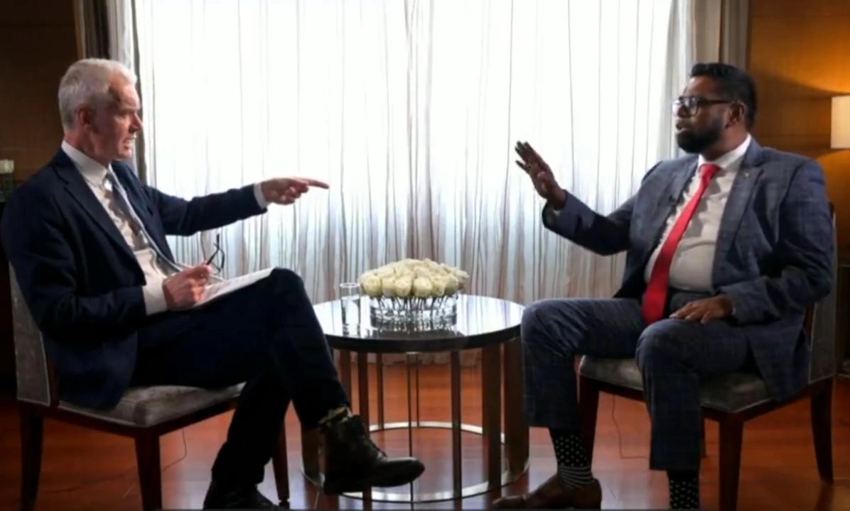 BBC主持人萨克尔(左)与圭亚那总统阿里对话 视频截图