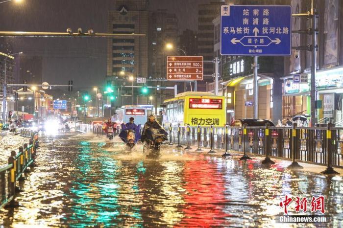 图为南昌一道路积水明显,市民骑车涉水而过。(资料图)刘力鑫 摄