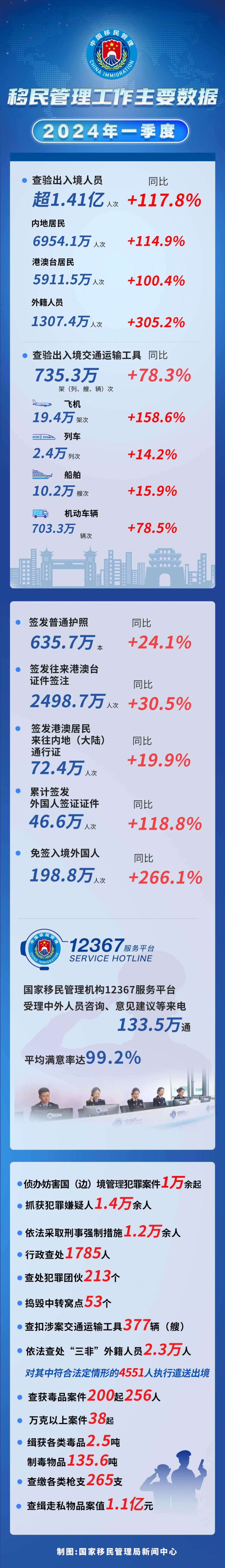 一季度,国家移民管理局推出一系列移民出入境政策措施,不断优化区域性入境免签、过境免签、口岸签证政策,推出便利外国人来华5项措施,扩大部分国家人员免签入境海南事由,支持福建建设两岸融合发展示范区,在西安市和青岛市为符合条件人员签发往来港澳“个人旅游签注”,大力提升移民管理政务服务水平。共签发普通护照635.7万本、往来港澳台证件签注2498.7万人次,签发港澳居民来往内地(大陆)通行证72.4万人次,同比分别上升24.1%、30.5%、19.9%;累计签发外国人签证证件46.6万人次、同比上升118.8%,免签入境外国人198.8万人次、同比上升266.1%;国家移民管理机构12367服务平台受理中外人员咨询、意见建议等来电133.5万通,平均满意率达99.2%。