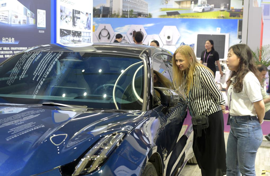 4月15日,采购商在第135届广交会上参观新能源汽车。新华社记者卢汉欣摄