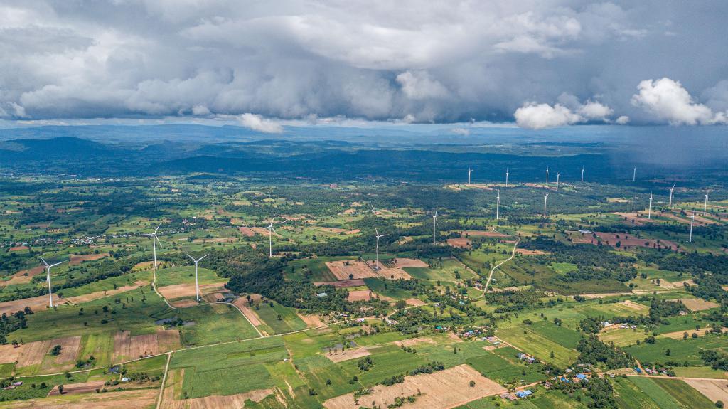 这是2023年10月5日在泰国猜也蓬府拍摄的由中国金风科技提供的风力发电机(无人机照片)。新华社记者王腾摄