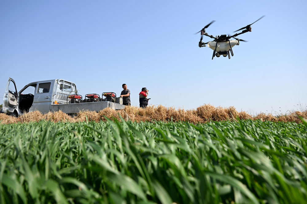 2024年3月22日,在安徽省合肥市庐江县同大镇,工作人员操作植保无人机为小麦施肥。新华社记者 黄博涵 摄