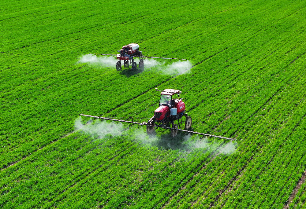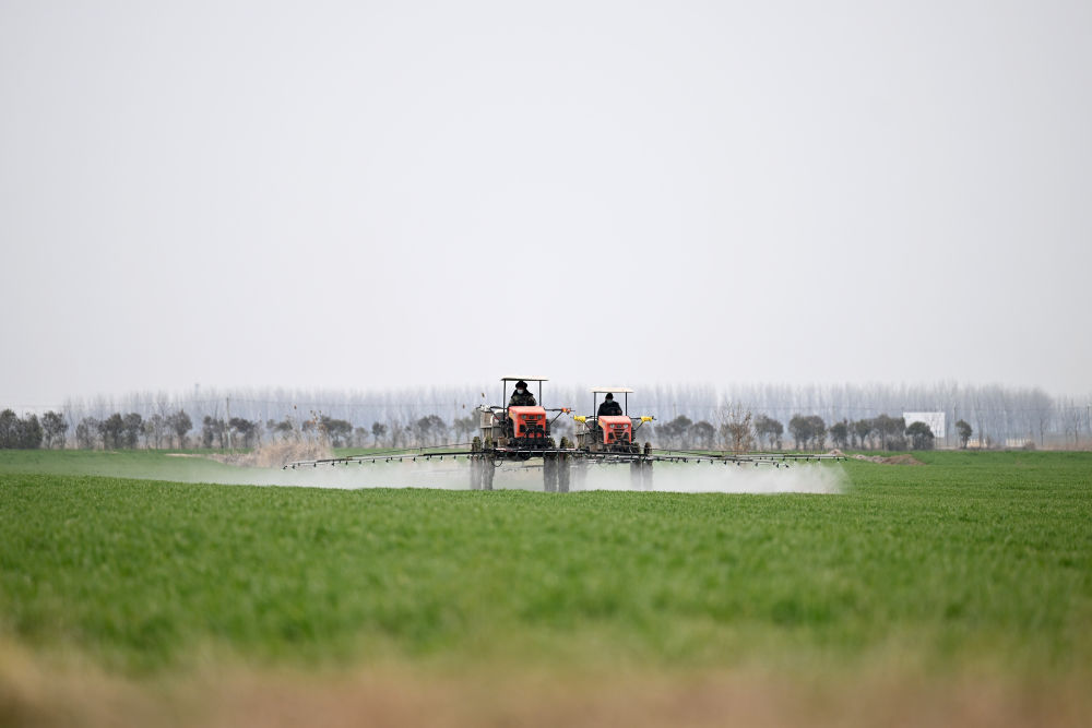 2024年3月13日,在安徽省蚌埠市五河县头铺镇,农民驾驶农机给小麦喷洒农药。新华社记者 黄博涵 摄