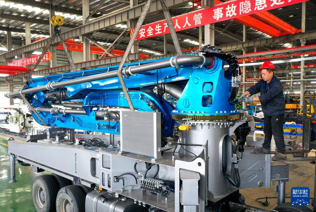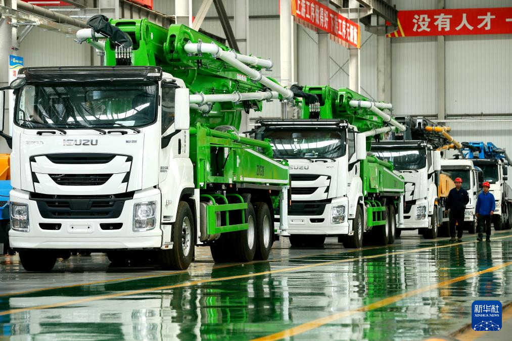 4月21日,在位于青岛市即墨区金口镇的青岛九合重工机械有限公司,工人在生产出口到海外市场的混凝土泵车(无人机照片)。