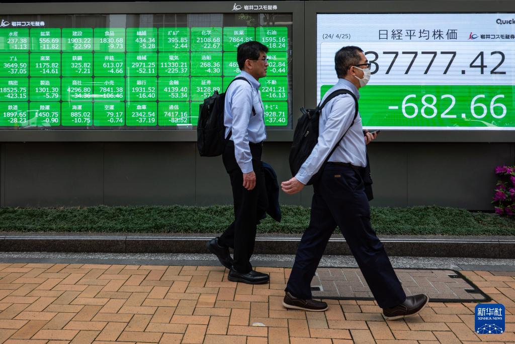 4月25日,在日本东京,行人走过股市信息显示屏。