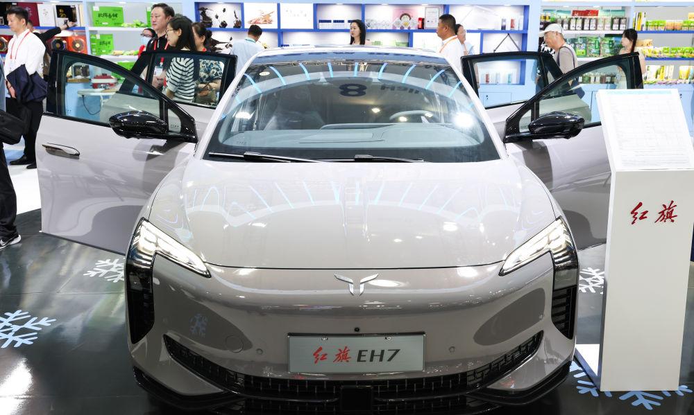 这是在第四届中国国际消费品博览会上展出的红旗新能源汽车(2024年4月13日摄)。新华社记者 杨冠宇 摄